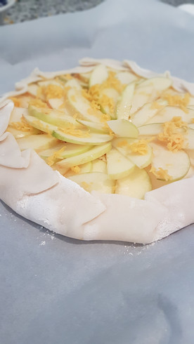 5. Gently fold the crust over the edge of the apples. Brush the egg over the crust and bake for approximately 40 minutes or until the crust is lightly brown.