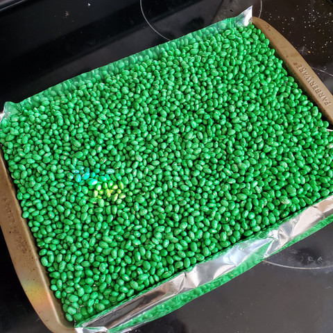 For St. Patrick's Day, I used green food coloring to dye navy beans bright green. Toss the beans in a mixing bowl or ziploc bag and drop food coloring in and mix until the beans are fully coated. I laid the beans out on a baking sheet to dry so the color wouldn't transfer to the girls' hands.